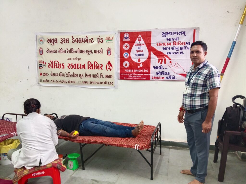 માનવ સેવાના પવિત્ર હેતુ સાથે એકલવ્ય મોડેલ રેસીડેન્સીયલ સ્કૂલ પારડી ખાતે અતુલ રૂરલ ડેવલોપમેન્ટ ફંડના સહયોગથી આજે તારીખ 11 ઓગસ્ટ 2025 ના સવારે 10:00 વાગ્યે સ્વૈચ્છિક રક્તદાન શિબિરનું આયોજન કરવામાં આવ્યું હતું.