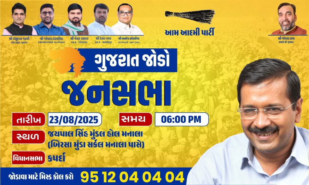 કપરાડા વિધાનસભાની કરચોંડ જિલ્લા પંચાયત વિસ્તારમાં આમ આદમી પાર્ટી (AAP) દ્વારા આગામી 23 ઓગસ્ટ 2025, શનિવારે સાંજે 6 વાગ્યે મનાલા બિરસા મુંડા હોલ ખાતે વિશેષ જનસભાનું આયોજન કરવામાં આવ્યું છે.