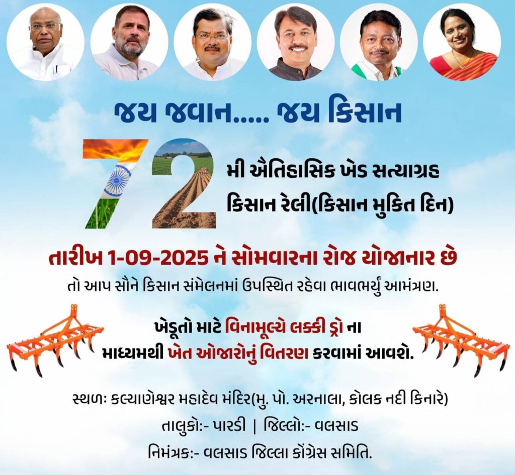પારડી તાલુકાના અરનાલા ગામે આવેલ કલ્યાણેશ્વર મહાદેવ મંદિર ખાતે તા. 1 સપ્ટેમ્બર, સોમવારના રોજ 72મી ઐતિહાસિક ખેડ સત્યાગ્રહ કિસાન રેલી (કિસાન મુકિત દિન)નું ભવ્ય આયોજન થવાનું છે. ખેડૂતોના હિત અને હક્કોને કેન્દ્રમાં રાખી યોજાનાર આ રેલીમાં મોટા પાયે ખેડૂતો જોડાશે તેવી આશા વ્યક્ત થઈ રહી છે.