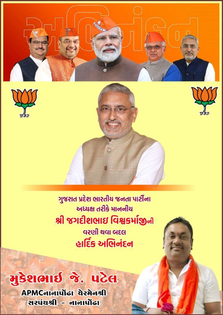 નાનાપોંઢા એ.પી.એમ.સી. ચેરમેન અને સરપંચ મુકેશભાઇ પટેલે ગુજરાત પ્રદેશ ભાજપના નવા અધ્યક્ષ તરીકે માનનીય શ્રી જગદીશ વિશ્વકર્માજીની વરણી થવા બદલ હાર્દિક અભિનંદન પાઠવ્યા છે. તેમણે જણાવ્યું કે જગદીશ વિશ્વકર્માજી વર્ષો સુધી પક્ષના મજબૂત સંગઠન અને જન સેવામાં અવિરત કાર્યરત રહ્યા છે. તેમની આગેવાની હેઠળ ભાજપ વધુ સશક્ત બનશે અને કાર્યકર્તાઓમાં નવી ઉર્જા પ્રસરે તેવી આશા વ્યક્ત કરી હતી. મુકેશભાઇ પટેલે જણાવ્યું કે વિશ્વકર્માનું સાદગી પૂર્ણ અને સમર્પિત જીવન સૌ માટે પ્રેરણાસ્રોત છે. તેમણે વિશ્વાસ વ્યક્ત કર્યો કે “સર્વજન હિતાય, સર્વજન સુખાય”ના સિદ્ધાંતને નવી દિશા મળશે અને ગુજરાતના વિકાસ યાત્રામાં ભાજપ નવી સિદ્ધિઓ હાંસલ કરશે…