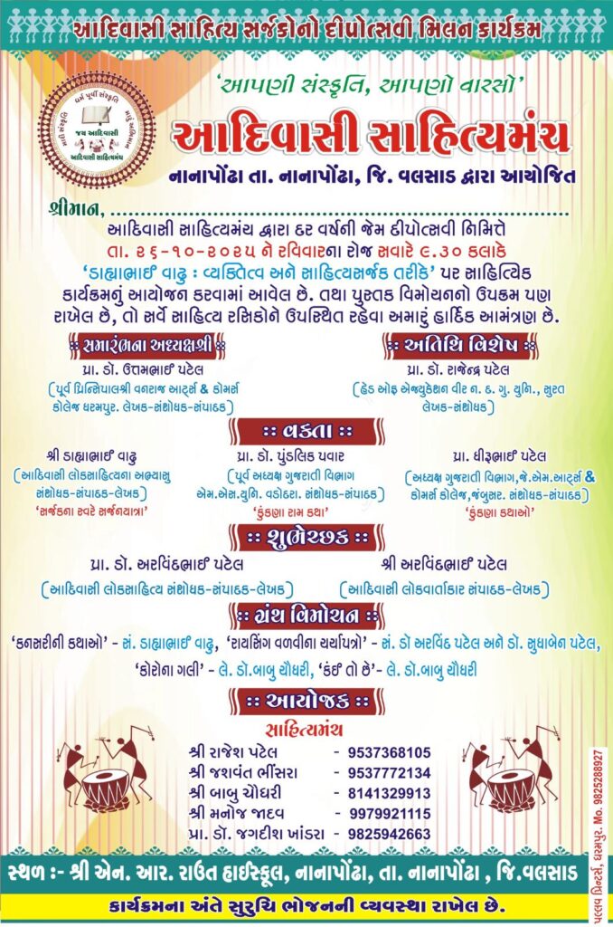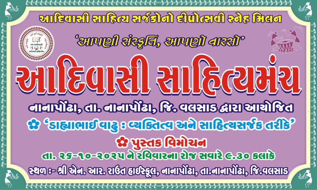 આદિવાસી સાહિત્ય મંચ દ્વારા નાનાપોંઢા એન. આર. રાઉત હાઇસ્કુલ ખાતે તા. 26 ઓક્ટોબર, 2025ના રોજ સવારે 9:30 કલાકે વિશિષ્ટ સાહિત્યિક કાર્યક્રમ યોજાશે. આ પ્રસંગે આદિવાસી ભાષા અને સંસ્કૃતિને સમર્પિત સાત મહત્વપૂર્ણ પુસ્તકોનું વિમોચન કરવામાં આવશે.